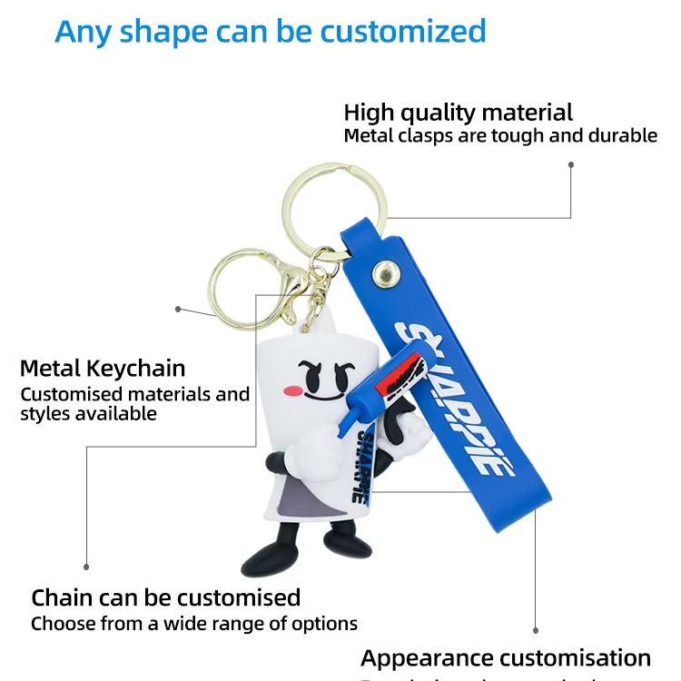 Tamamilə xüsusi 2D və ya 3D dizaynları ilə marka və ya fikrinizi həyata keçirin. Bir loqotip, maskot və ya şüar olub-olmaması, yumşaq PVC anahtarlarımızı canlı rəng və yüksək detallarla uyğunlaşdırmaq üçün uyğunlaşdırılmışdır.