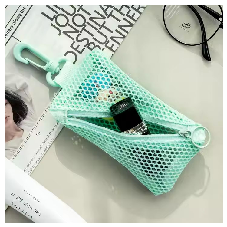 Diagonal kiçik fermuar sikkə sikkə pul kisəsi mesh dodaq boyası çantası. Sırt çantalarına, çantalar və ya məktəb çantalarında asmaq üçün çəngəl ilə yüngül və nəfəs alan dizayn. Gündəlik istifadə və ya səyahət üçün mükəmməl fərdi aksesuar.