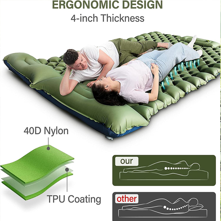 İki nəfərlik düşərgə Yuxu yatmaq pad şişmə düşərgəsi pad, açıq sərgüzəştlər üçün ikiqat rahatlıq. Bu şişmə iki nəfərlik düşərgə pad sürüşmənin qarşısını almaq üçün innovativ bir ayaq məhdudlaşdırıcı dizaynı olan geniş yuxu sahəsi təklif edir. Ultra yüngül bir həll yolu olaraq, düşərgə cütləri və dostları üçün misilsiz daşınma və paylaşılan rahatlıq verir.